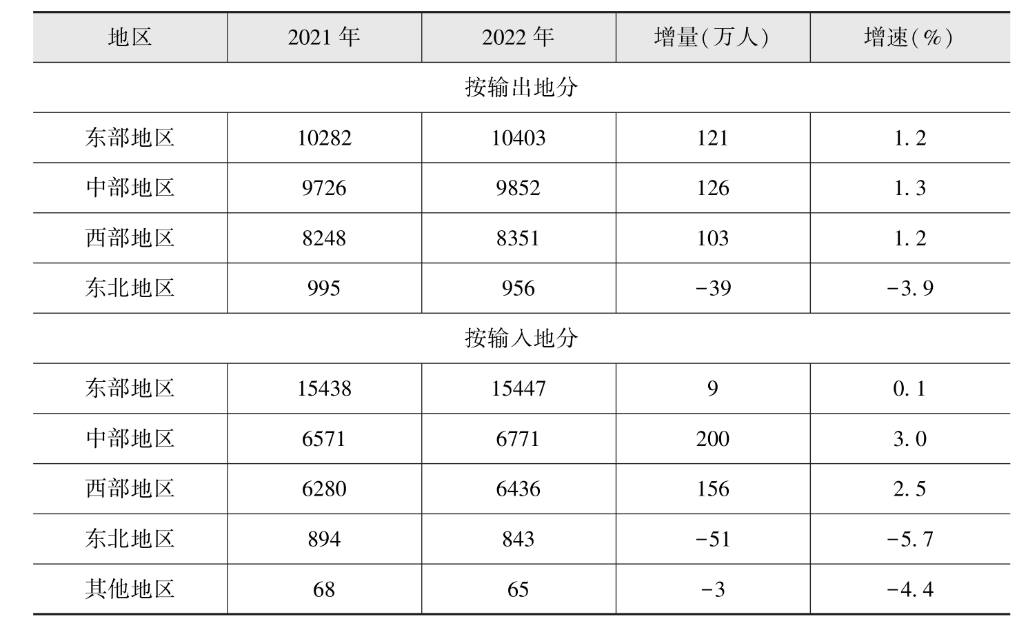 表1-3 2022年外出农民工输出地区与输入地区分布与增速