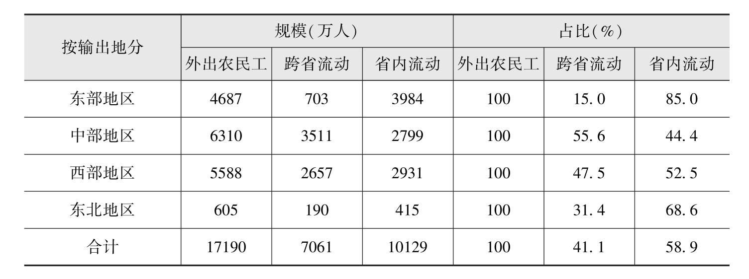 国家统计局数据显示,2022年全国农民工总量超2.95亿(见图1-1)。预测数据显示,2020—2030年每年将新增农民工200万~300万,到2030年农民工总量将突破3.00亿,其中多数是举家迁移的农民工,人口城市化率将达到68%~70%。在外出农民工中,跨省流动的有7061万,比上年减少69万,下降1.0%;省内流动的有10129万,比上年增加87万,增长0.9%。从输出地看,中部地区跨省流动农民工占外出农民工的比重为55.6%,西部地区为47.5%,东北地区为31.4%,东部地区为15.0%(见表1-2)。