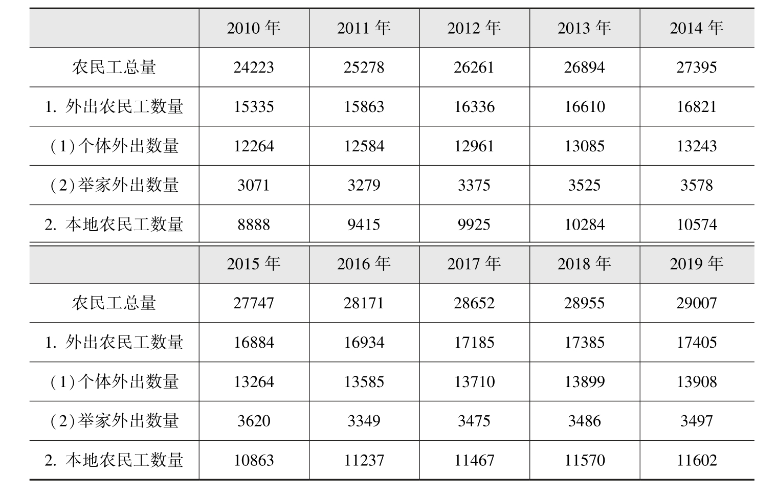 统计数据显示,2022年我国常住人口城镇化率为65.22%,户籍人口城镇化率约为45%。究其原因,一方面是城乡二元体制改革的滞后,另一方面是城市需要承担的公共服务成本增加。2010年我国农民工总量约为2.42亿,其中外出农民工约为1.53亿。2015年我国农民工总量约为2.77亿,其中外出农民工约为1.69亿。 2016年我国农民工总量约为2.82亿,其中外出农民工约为1.69亿。2017年我国农民工总量约为2.87亿,其中外出农民工约为1.72亿。 2018年我国农民工总量约为2.90亿,比上年增加303万。 “十三五”期间每年新增农民工350万~450万,人口城市化率约为60%。2010—2022年我国农民工规模与结构情况如表1-1所示。