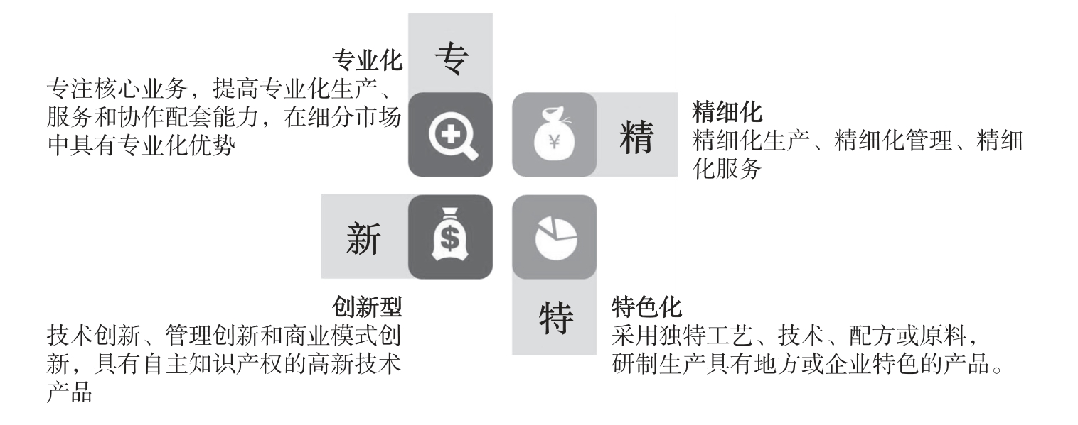 由此可见,专精特新中小企业是我国中小企业中具有专业化生产技术或工艺,并具有精细化管理特点,能够生产特色和创新性产品的制造业企业。专精特新既是一个整体,也存在着内在的相关性,其中“新”是核心,是灵魂;“专、精、特”是手段和方式,是“新”的不同表现。专精特新中小企业相关特征如图1-1所示。