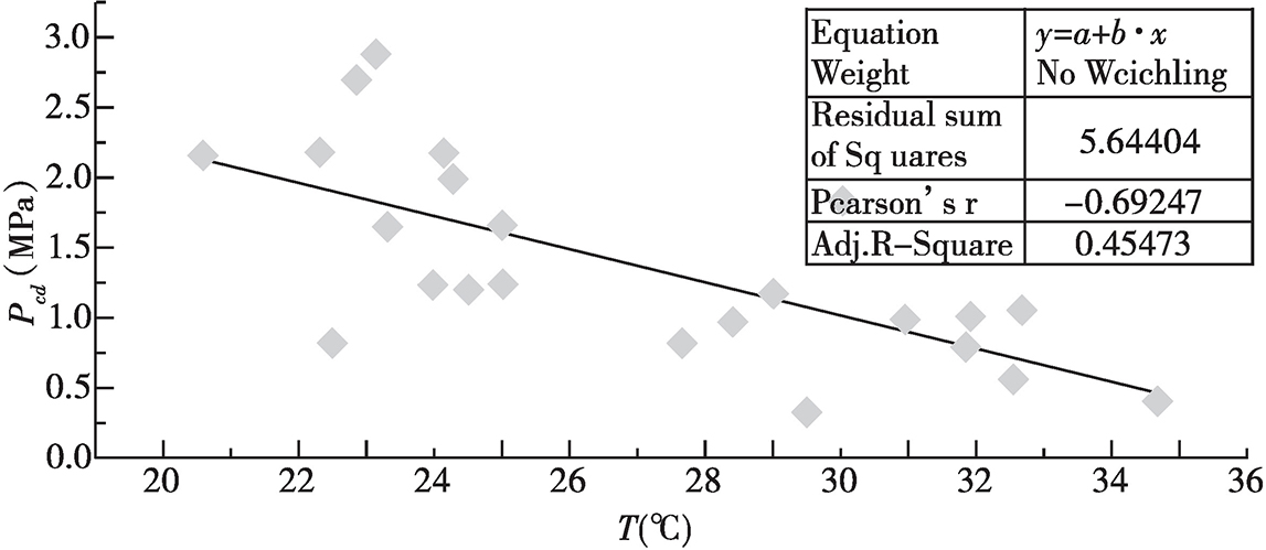 煤系地层的温度—压力场是其内部能量的综合体现,是区域地层构造活动长期耦合的结果,也是影响煤层气勘探开发的重要因素 [13,14] 。多井多煤层临界解吸压力与 H 、 p 呈正相关,与 T 呈负相关,皮尔逊相关性为0.6左右(如图7、图8、图9所示),煤层埋深主要是通过控制含气性的变化而影响煤储层的临界解吸压力。煤层埋藏得越深,煤层中的气体向地表运移的距离就越长,散失就越困难。同时,深度的增加也使煤层在上覆地层压力的作用下降低了透气性,增加了储层压力,有利于气体的保存,而温度增加会导致含气量降低,这主要是由于温度增加对于分子扩散运动的促进作用,因此温度与临界解吸压力呈负相关关系。