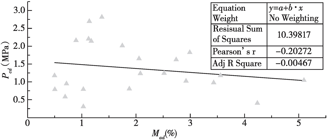 一般认为水分子可以被煤吸附,并占据一定的内表面积。随着煤中水分含量的增加,煤内表面吸附的水分子也越来越多,水占据了煤内部分孔隙,减少了煤吸附甲烷的有效面积 [15] ,导致吸附难度增大,甲烷的最大吸附量减少,吸附能力下降,进而使煤样的临界解吸压力降低。图10为不同煤层煤样水分含量与临界解吸压力的关系,可以看出其临界解吸压力随水分含量的增加而降低,符合上述规律,但相关性较弱,说明其并不是主要影响因素。