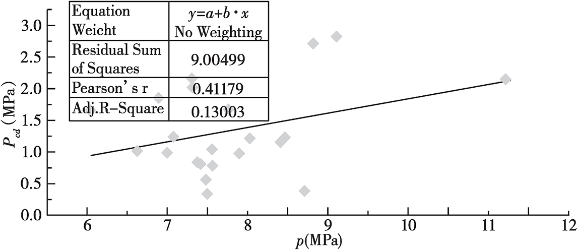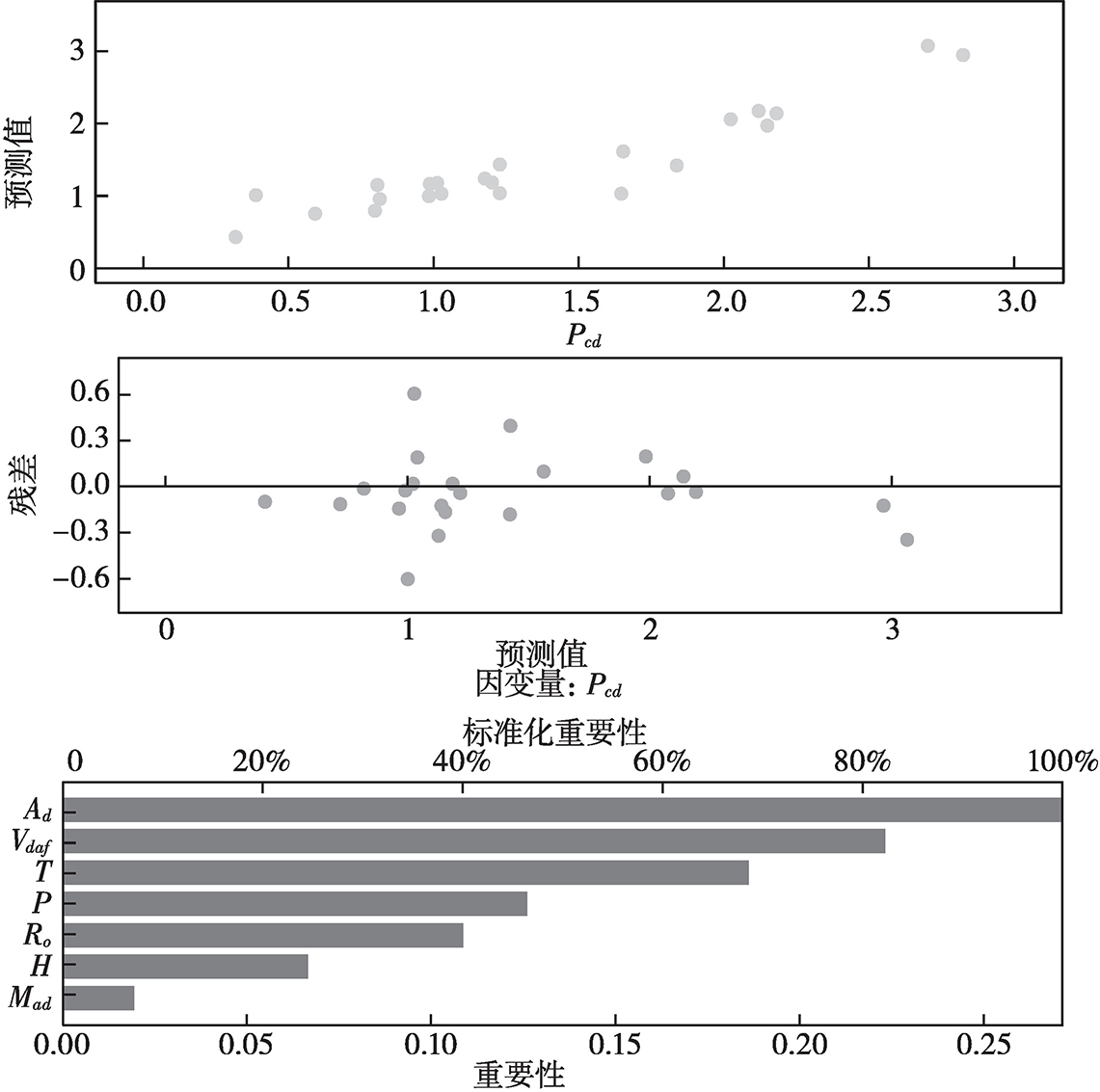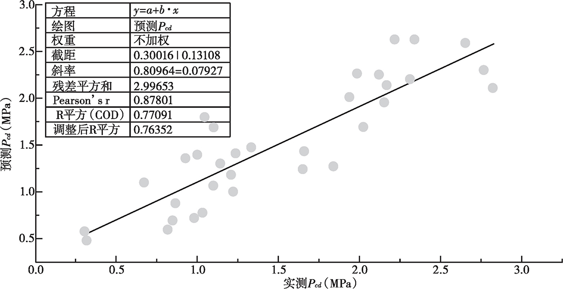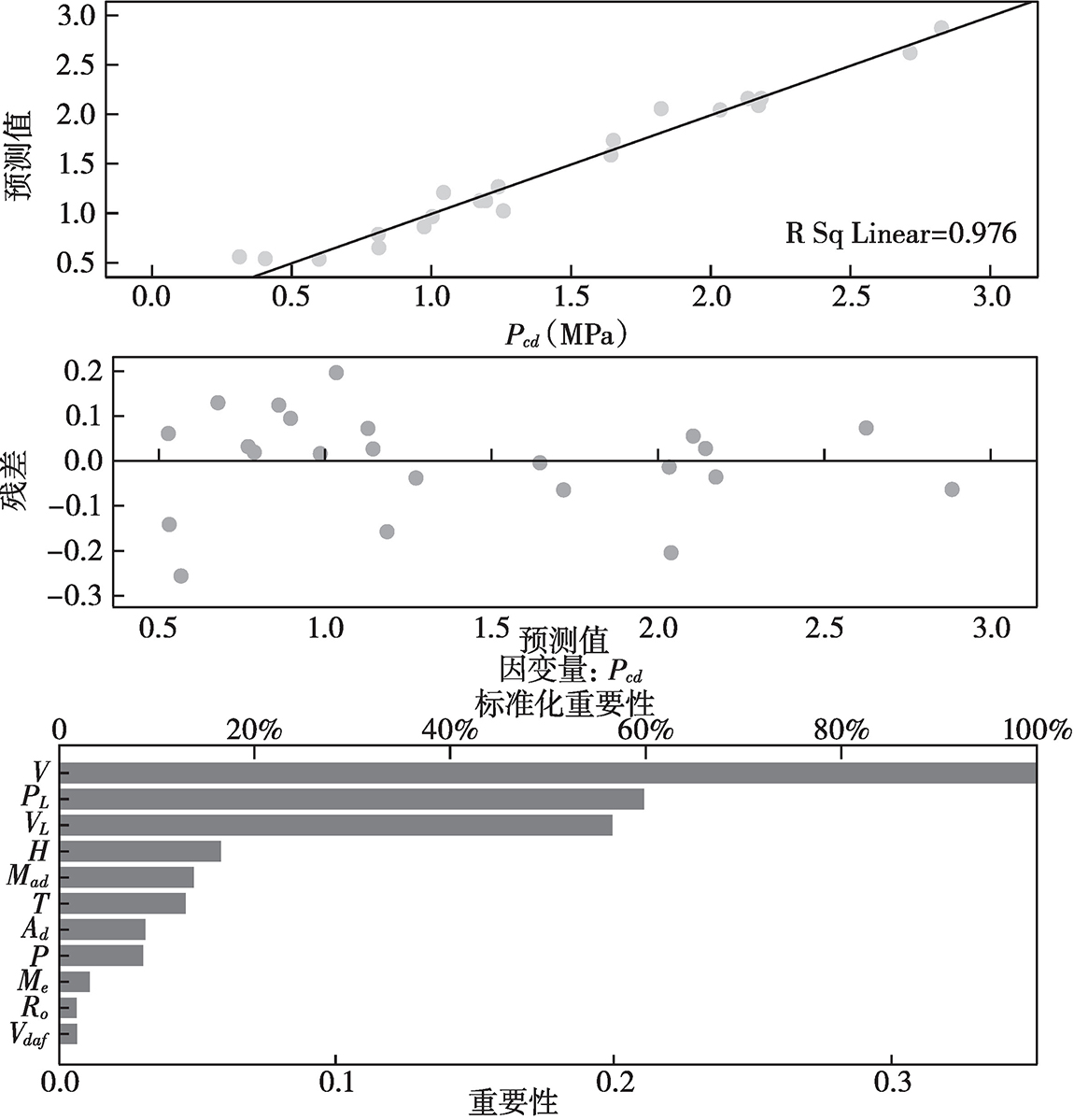 从图15中的第一幅图可以看出,神经网络分析方法确实可以用来进行临界解吸压力的预测,但是需要进行多次培训,从结果不难发现 T 、 A d 、 V daf 三个参数标准化重要性相对其他参数较高,因此,基于神经网络预测模型的结果尝试进行进一步分析,采用最常用的多元回归模型,进行回归计算,增强适用性,调整后的R 2 为0.63。