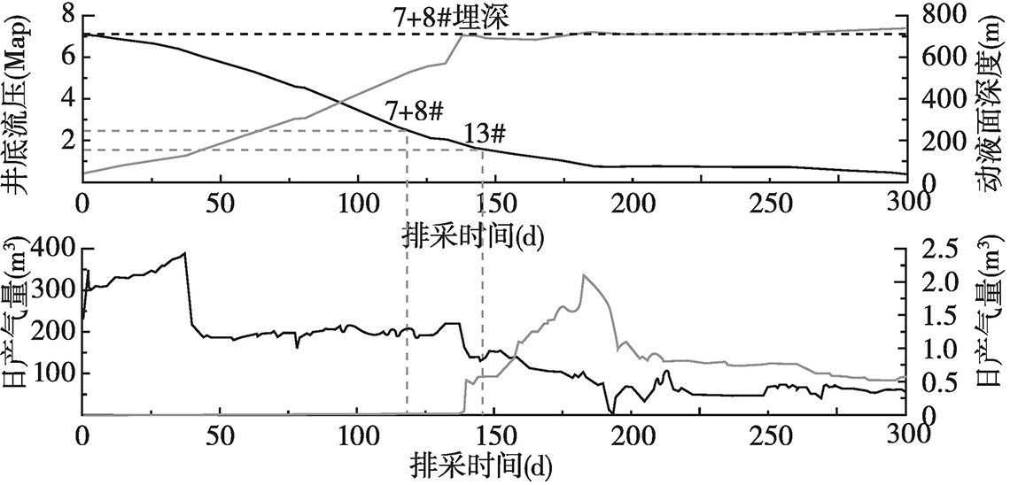 以LC-C1井为例,该井下泵深度为773.35m,约在13 # 煤层底板深度,根据公式(5)计算7+8 # 煤层临界解吸压力约为1.78MPa、13 # 煤层临界解吸压力约为1.61MPa(如表2所示),两煤层间距55m,压差为0.55MPa,所以7+8#煤层首先解吸。实际排采数据显示(如图17所示):排采至123天左右,井底流压降至1.987MPa,7+8 # 煤层开始解吸,由于泵放在13#煤底板附近,此时流压是以13#煤底板为深度起算的,对于7+8#煤来说,其实际流压为1.437MPa。预测临界解吸压力略大于实际见气套压。排采到第150天左右,日产气量出现明显上升,推测13#煤开始解吸,此时井底流压为1.460MPa。预测临界解吸压力为1.614MPa。预测结果略大于实际见气套压,但在允许范围之内。