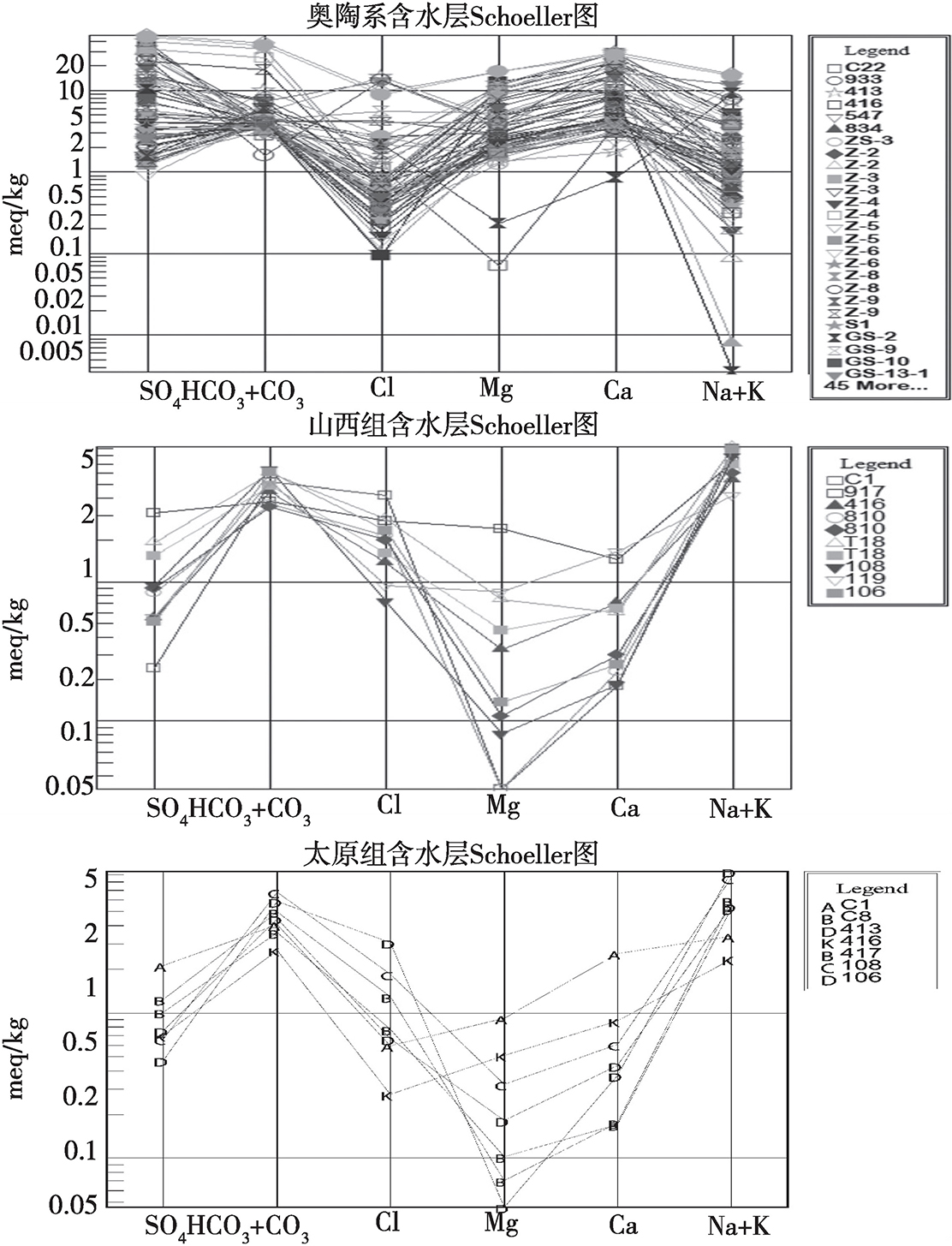 本文收集了沁水盆地以往的煤田水文勘探资料。先将不同含水层的水化学类型进行对比(如表1所示)。为了整体分析各含水层主要离子浓度分布特征,本文以对数为纵坐标,毫克每升当量百分数为单位,绘制Schoeller图(如图1所示)。从图1中可见,煤系地层地下水是溶滤作用所形成,在风化、水解及离子交换等作用下,砂岩中的Na+和K