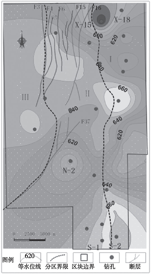东部缓坡带(Ⅰ区):以地下水为分水岭,与Ⅱ区分割开来,东南边缘初始动液面标高最高S-1井658.984m;东部初始动液面标高最低,X-15井548.313m,X-18井586.926m,东北部总体显现由西向东径流的特点。