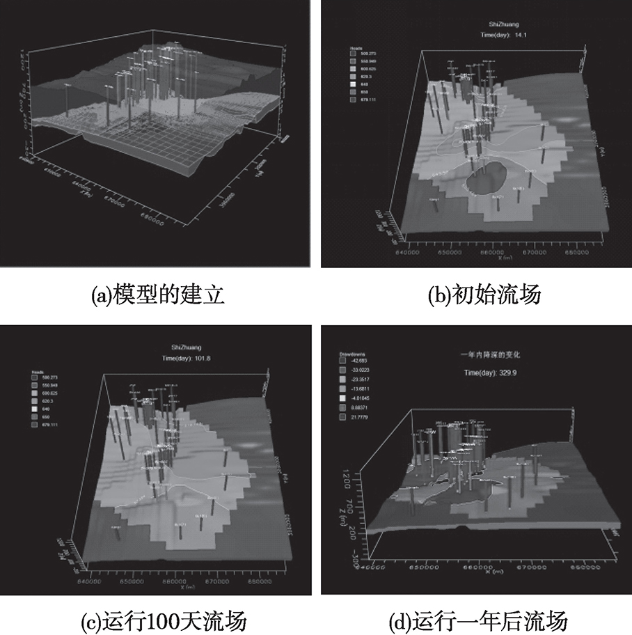 根据预测模型检验标准,反复调试模型的参数拟合地下水位,并模拟出各时段含水层地下水流场变化(如图6所示)。从图6中可以看出,模型运行第100天的流场和模型运行初期的流场相比较,总体变化不大,还是由研究区东南部向东北部和西南部排泄,局部流场略有变化。水位比模型运行初期略有下降,但下降幅度不大。模型运行200天流场和运行一年流场较运行100天流场,变化不大,水位下降约20m。