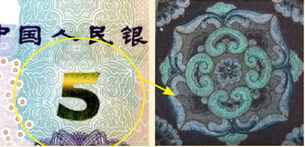 5元钱纸币正面的繁复图案取材于宫庙建筑的构件——藻井。它相当于现在的天花板,只是这个天花板是伞盖形的。