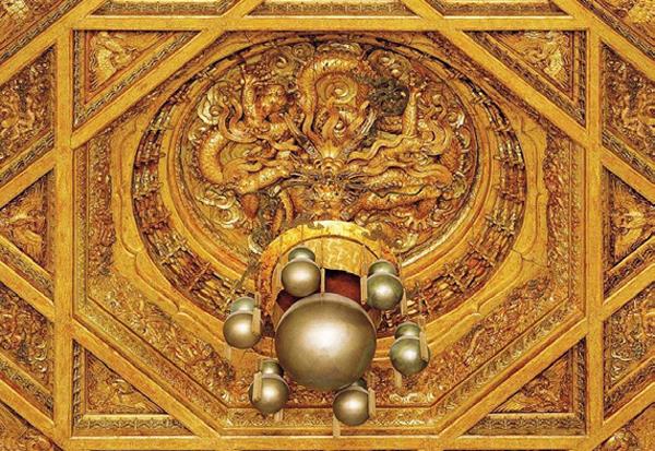 同属于宋辽金时期的现存藻井,或质朴无华,或华贵富丽,均有很强的结构性。到了元明清时期,藻井的结构性逐渐弱化,装饰性却日趋精巧,雕刻工艺的运用也越来越多。清代藻井的一大代表作便是故宫太和殿的藻井:八角井上置一圆井,当中做突雕蟠龙,垂首衔珠,又称“龙井”,堪称藻井艺术最后的辉煌。