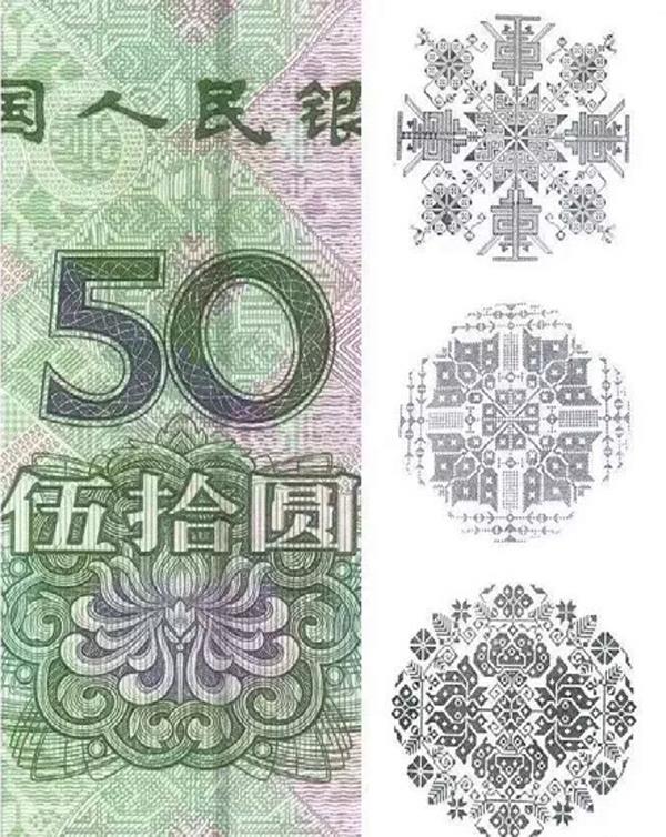 50元钱纸币上,有一组图案源自古老的国家级非物质文化遗产——羌族刺绣。一般认为,羌绣最早可以追溯到新石器时代,今天主要流行于四川、贵州的羌族聚居区。美丽的羌族姑娘从很小的时候就开始学习刺绣针法。一不打样,二不画线,她们仅凭智慧与巧手,就能信手绣出精致而绚丽的图案。图案大多取材于现实生活,如花草、瓜果、动物、人物等等。