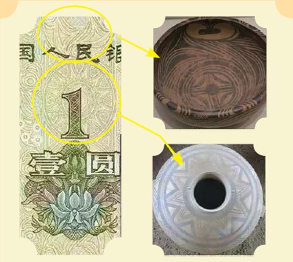 除此之外,1元钱背面底部还有一层大汶口文化(公元前4400年——公元前2400年,山东泰安)的彩陶回纹;正面也有两处马家窑文化(公元前3300年——公元前2050年,甘肃临洮)的彩陶纹饰。这些丰富多彩的纹饰艺术,穿越历史长河,到今天仍历久弥新。