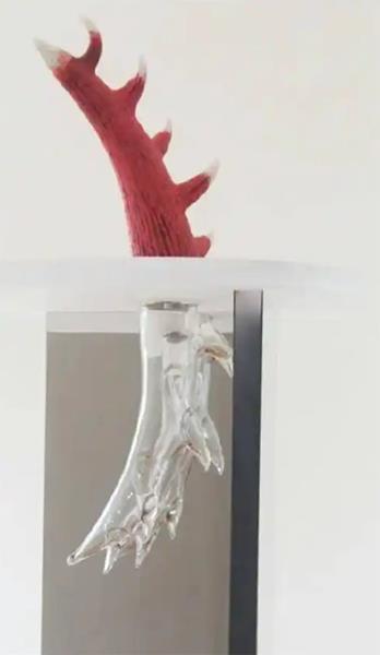 《镜像·角》这件玻璃艺术品的主体嵌在铁质台面上,上半部分用陶瓷制作,像带刺的植物,又像分叉的兽角,下半部分采用了吹制工艺,如同上半部分的倒影,又似地下蔓延的根茎。这幅作品看似脆弱实则坚硬,在镜面上层层放大,借助材质与造型碰撞出的力量,展现了可见与不可见、强大与脆弱的辩证转换。