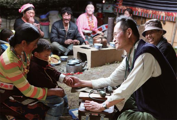 王万青(前排右一)为藏族群众看病 曹义成/摄