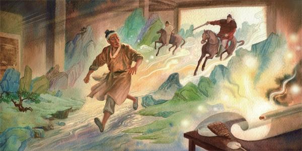 大家当然不信,以为他在说醉话。郭秀才还跟他打赌五千钱,柳成自信满满,腾空一跃就钻进画里。在座的客人无不大惊失色,他们在画上一阵摸索,可是什么也没有发现。