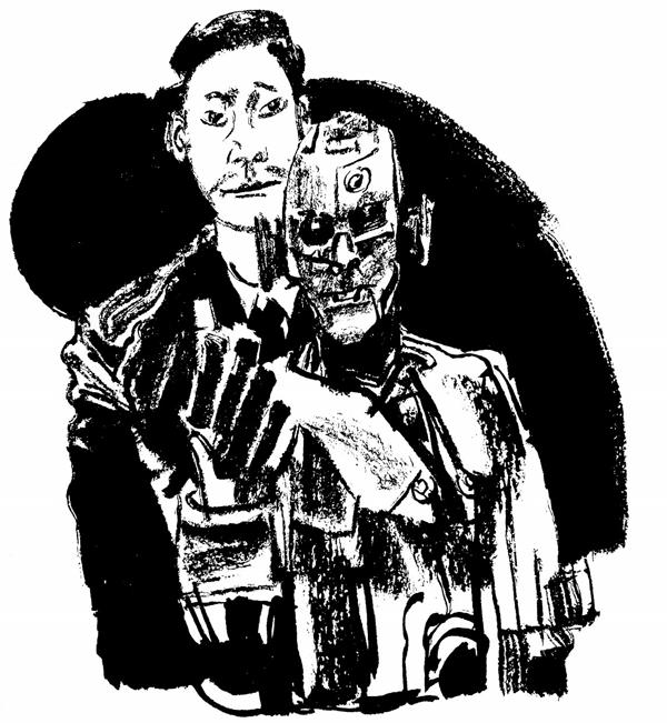 N先生迎上去,揭开科长脖子后面的小盖子,为他注入润滑油。这位科长其实是一个机器人。N先生是他的主人。机器人的体貌特征与N先生大致相似。