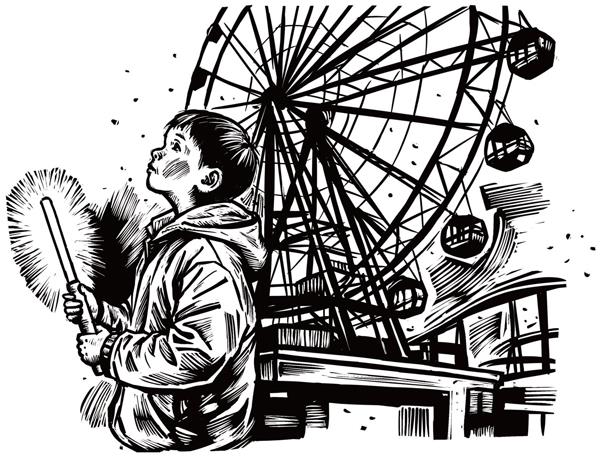 当男人再一次出现在摩天轮下时,男孩才松了口气。他对自己刚才的怀疑感到羞愧。现在他放心了,男人不会丢下他。
