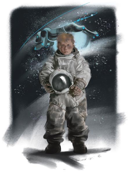 正如他母亲所说,此时吉米在环形山上。根据地球的标准,就一名十岁男童而言,他身形苗条,个子相当高,四肢又长又灵巧。现在他穿着太空衣,看起来较为臃肿、粗短,但他仍能轻易应付月球的重力,这让任何生于地球的人望尘莫及。每当吉米伸长双腿,开始青蛙跳时,他的父亲便会落后。