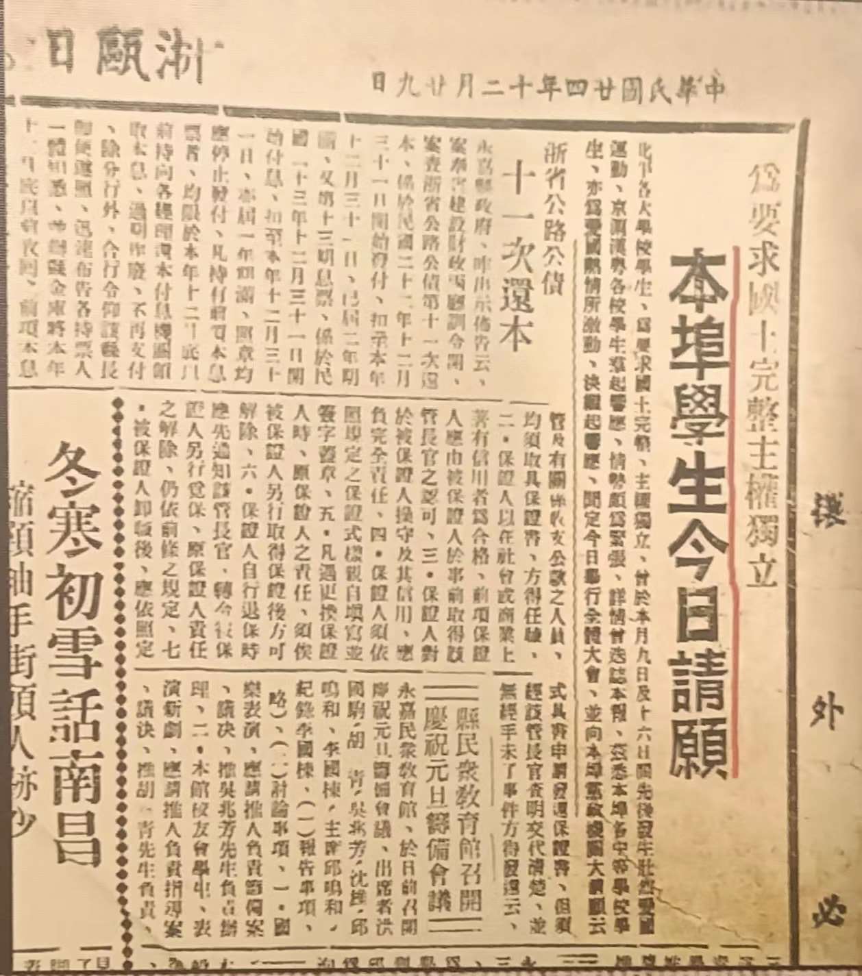 12 月 9 日和 16 日北平上万学生上街游行示威,请愿抗日,遭到反动派的残酷镇压。北平“一二·九”学生运动消息迅速传到温州,温州各中学以省立温州中学学生为主,闻风响应。