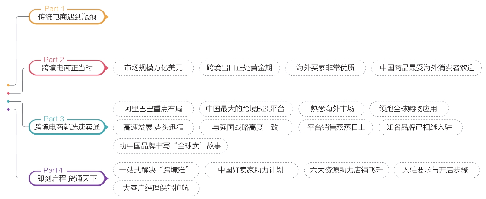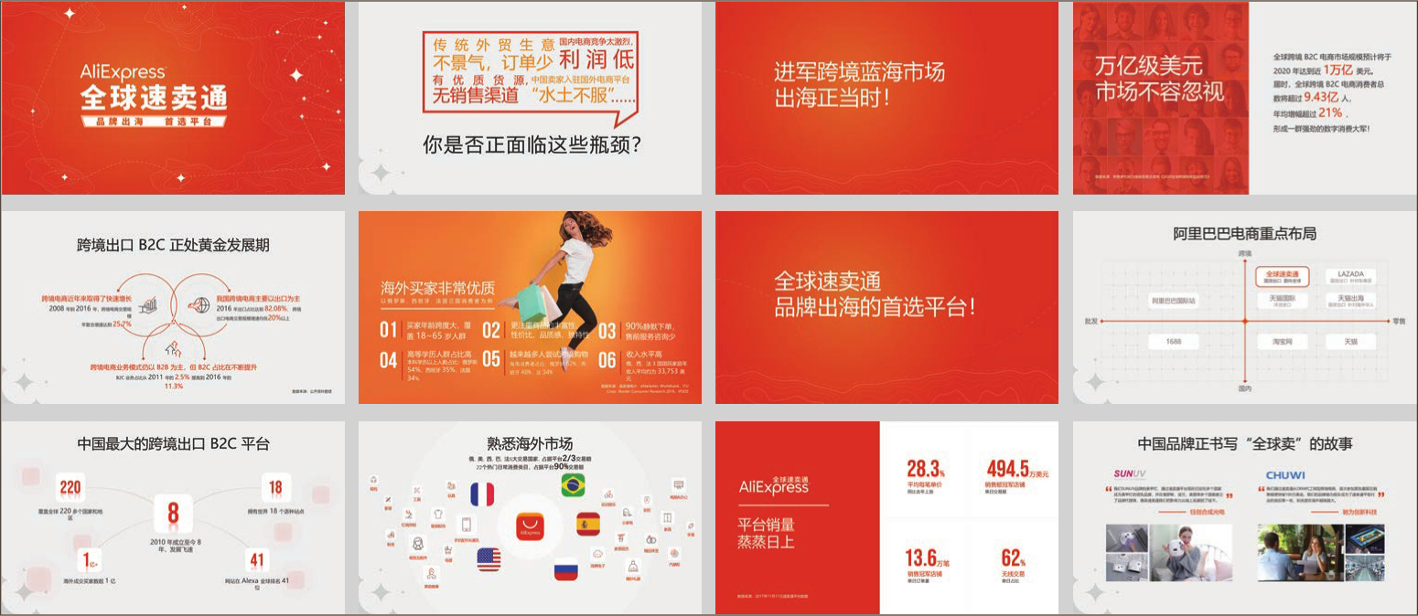 然而,对观众来说,跨境电商仍是一个相对陌生的领域,该怎么做呢?接下来就直接告诉观众解决方案——跨境电商就选速卖通。用一系列的论据证明,速卖通就是最佳的跨境电商平台选择。