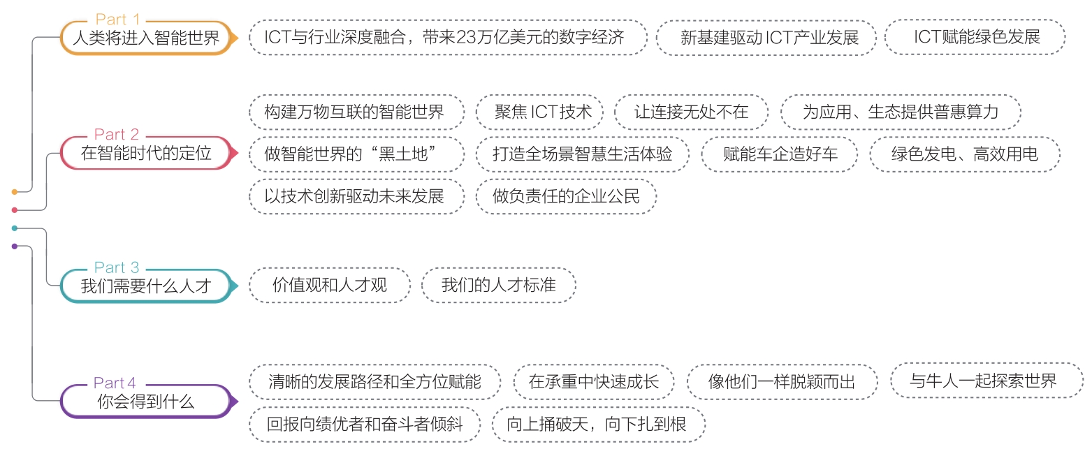 接下来,PPT描述该公司在智能时代的定位——构建万物互联的智能世界,聚焦ICT技术,让连接无处不在,为应用生态提供普惠算力,做智能世界的“黑土地”,打造全场景智慧生活体验……每一项定位,都是从人类、社会、行业的高度来定义,每一页内容都充满了对未来世界的期待,让学生们心潮澎湃。