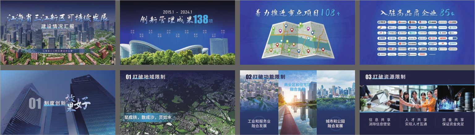 这是某市新区建设情况汇报的PPT。演讲者为新区领导,领导读文字稿,助理会为其操控PPT翻页。每个页面都做得大气磅礴,文字少、图片大、留白多,让观众像看电影一样,目不转睛。