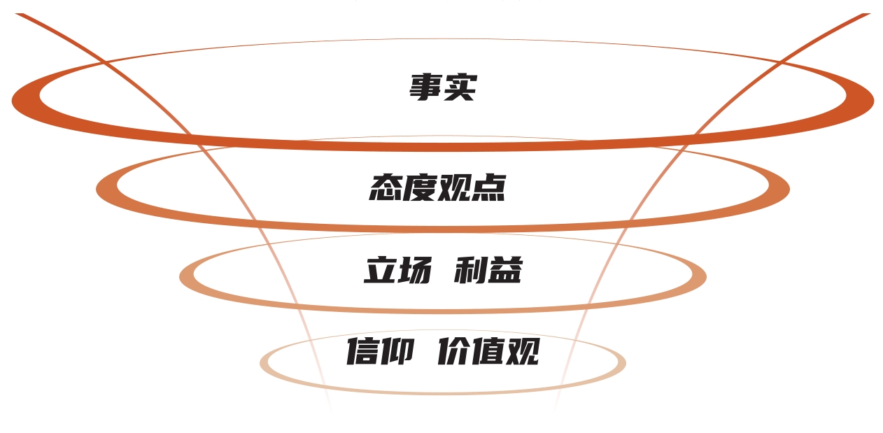 我们要明白,观众的认知是分层次的。首先,知道观众了解了哪些事实,我们不要过多重复观众所了解的事实;然后,了解基于这些事实观众是什么态度、持有什么观点,我们是要强化观众的观点还是改变观众的观点?之后还要弄清观点背后观众的立场、利益是什么?以及观众的信仰、价值观是什么?这决定了你演示的路径。