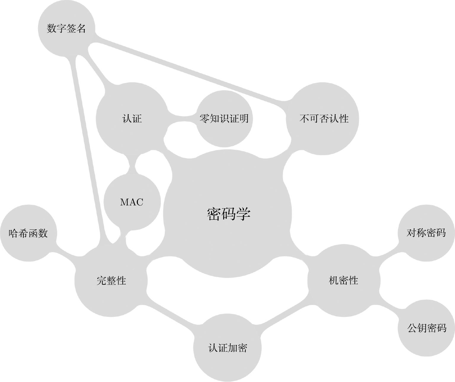 机密性、认证、完整性和不可否认性这 4 点构成了密码学的基本要素,是密码学的基石。在设计密码及对密码的安全性进行测试时都会把以上基本要素作为考虑的重点,全面地思考所面对的问题,如图 1-7 所示。