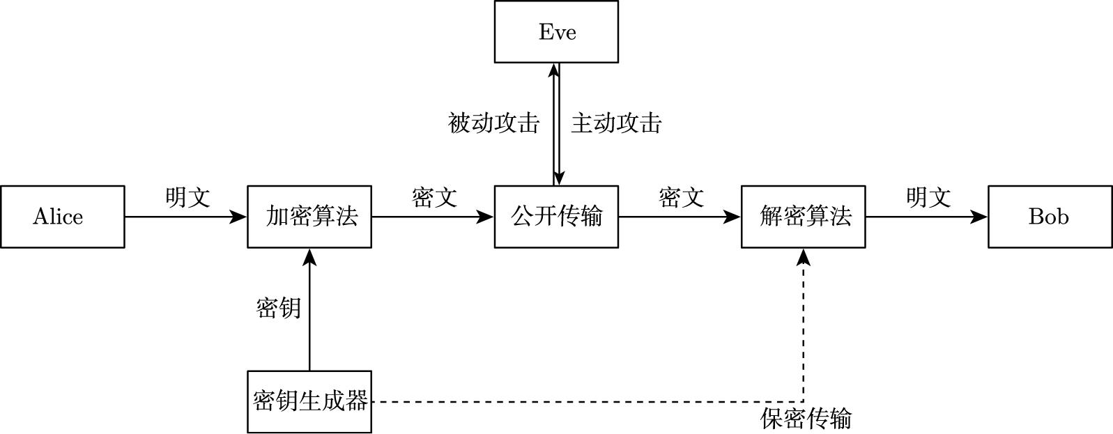 攻击者 Eve 会寻找密码使用过程中最脆弱的环节,不仅限于算法,还包括密码传输、管理等。换句话说,密码使用者必须使用足够安全的算法,也必须保证可以抵御实施攻击和社会工程学攻击。本书将会重点介绍经典密码分析方法,也会简单介绍实施攻击和社会工程学攻击。