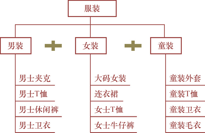 ● 行业:要想深入地研究某一细分领域的数据,就需要对行业进行细分。图2-1所示的是对服装行业进行细分的一种方式示意。