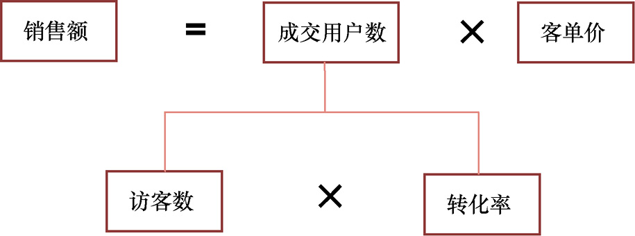 例如,在做成交分析时,销售额=成交用户数×客单价,成交用户数=访客数×转化率。应用乘法思维对销售额这一数据指标进行分解,可以得到图2-2所示的示意图。