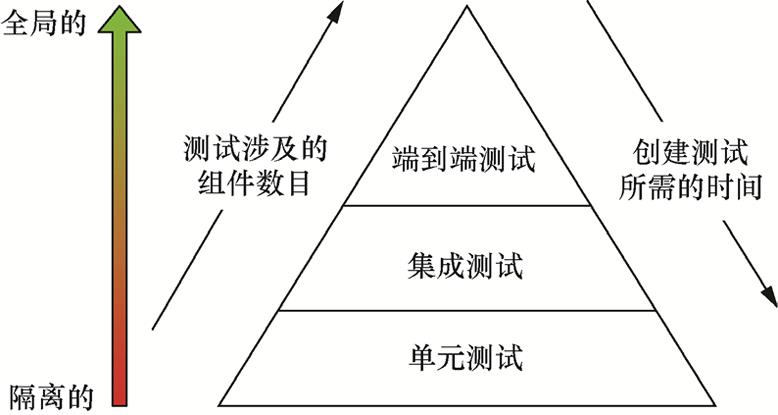 图1.1所示为一个金字塔,这是因为通常情况下,软件系统中的单元测试比集成测试多得多。单元测试可以为开发者提供几乎即时的反馈,从而帮助提升开发效率。单元测试的执行速度更快,可以帮助减少代码调试的时间。如果单元测试100%覆盖了你的代码库,当一个新的缺陷被引入时,很可能某个单元测试能发现这个缺陷。你可以在单元测试覆盖的方法级别上精确定位该缺陷。