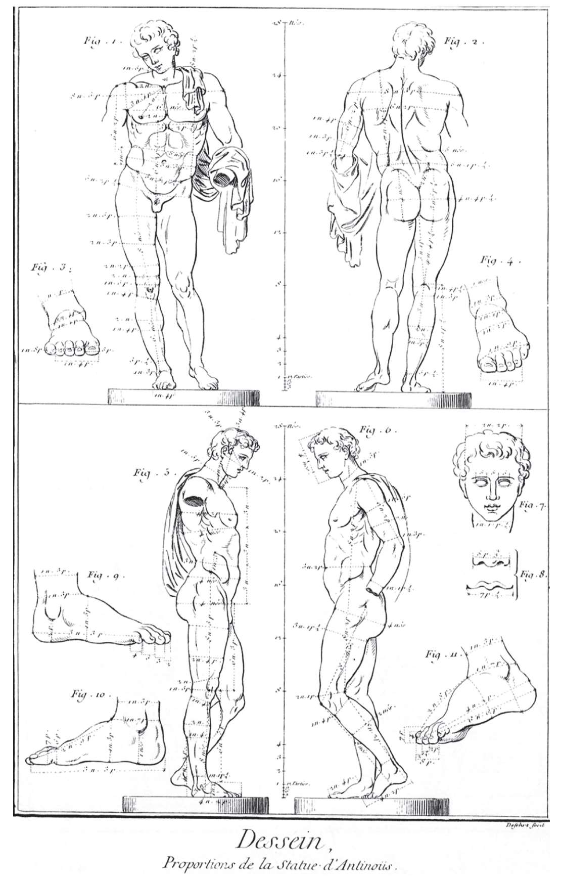 我们很容易看出,这个例子再次说明语言中的一种奇怪现象——一个词有时会转变成它的反义词。以前,一个单词的意思是A;但现在,它的意思非A。规则曾经指模型或范式,但现在,它的意思正好相反。因此,库恩要处理的难题是,如何既说清楚什么是范式,又不至于使其简化为规则,即不将A简化为非A;同样,维特根斯坦将规则等同于习惯和风俗,这既具有挑战性,又难以自圆其说。但是,相比从意义A到意义非A的变化,“规则”一词的前现代同源词更丰富,也更不稳定,而这说明,我们所熟悉的该词的现代家族的成员,仍然是它的前现代同源词含义的一部分。例如,古希腊文 kanon 一词常比喻十分难得的精确性,尤其是建筑和大木工方面的精确性;当它被用于艺术、政治、音乐和天文学等其他领域时,也有此意。创作雕塑《持矛者》的波留克列特斯还著有《模范》( Kanon ),不过这部著作现已失传。在该著作中,他详细说明了艺术家应遵循的人体的确切比例,他所规定的古典雕像的尺寸在18世纪的雕塑中仍然可见(见图1.3)。古罗马医生、哲学家盖仑曾援引波留克列特斯的表述,据此,安德烈亚斯·维萨里等现代早期解剖学家开始使用“模范人体”(canonical body)之类的词和概念。 [20] (见图1.4) kanon 一词的变体词还出现在古代天文学与和声学中——二者都可以说是数学科学。拉丁文 regula 一词的内涵与希腊文 kanon 的内涵高度一致。 [21] 这个语义让人想到数学的严谨性,无论是用作几何比例原理时,还是用作测量和计算的工具时;而且,这个语义与那个以模型和范式为核心的语义并行不悖。简而言之,几千年来,在各种古代和现代的欧洲语言中,rule(规则)这个词及其同源词可以同时意味着A和非A,至少按现代观点看如此。这种语言现象在今天的人们看来已经见怪不怪,真是让人难以置信。