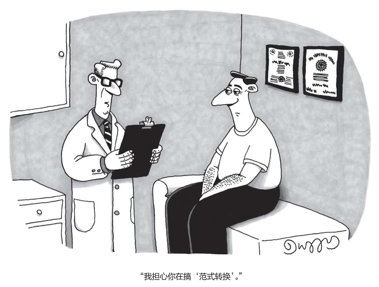 关于规则与范式的对立,最经典的哲学论述是科学史家、科学哲学家托马斯·库恩的《科学革命的结构》( Structure of Scientific Revolutions ,1962)。该著作很有影响力,热销几十万册,曾经是大学里一门固定的跨学科课程。 [10] 正是这本书,使得“范式”成为家喻户晓的热词,还成为《纽约客》杂志的漫画素材。(见图1.1)根据库恩的说法,一门学科只有在“范式”上具有开创性时,才配得上“学科”这个名词。范式被写成教科书,科学工作者依据这种教科书式的范式分析问题的构成是什么,了解如何解决问题。科学革命无非是一种范式推翻另一种范式。正因为“范式”有如此多的用途,所以它在库恩的著作中有很多含义,细数起来,有21个。 [11] 库恩本人一直强调,范式是示范,是与规则相对立的,他认为这是范式的一个很重要的特性。在1969年版《科学革命的结构》的后记中,库恩称,在这个意义上,范式就是“模型或示例,可以取代明确的规则,为解决常规科学不能解决的难题提供基础”——一种“更深层”的哲学基础。 [12] 不过,他没有解释这个基础是如何发挥作用的。为避免被斥为非理性、异想天开,他坚定地辩称,范式所传递的知识是真正的知识。他说:“当我谈论某种知识,某种由可共享的样本所承载的知识时,我指的是一种认知模式,就其系统性、可分析性而言,它并不逊色于规则、法律或认证标准等所承载的知识。”但是,迄今为止,没有任何人,包括库恩本人在内,能够讲清楚这种替代性的认知模式到底是什么。 “玄学……说白了不过如此。” 哲学家伊恩·哈金 [13] 如此总结。 [14]