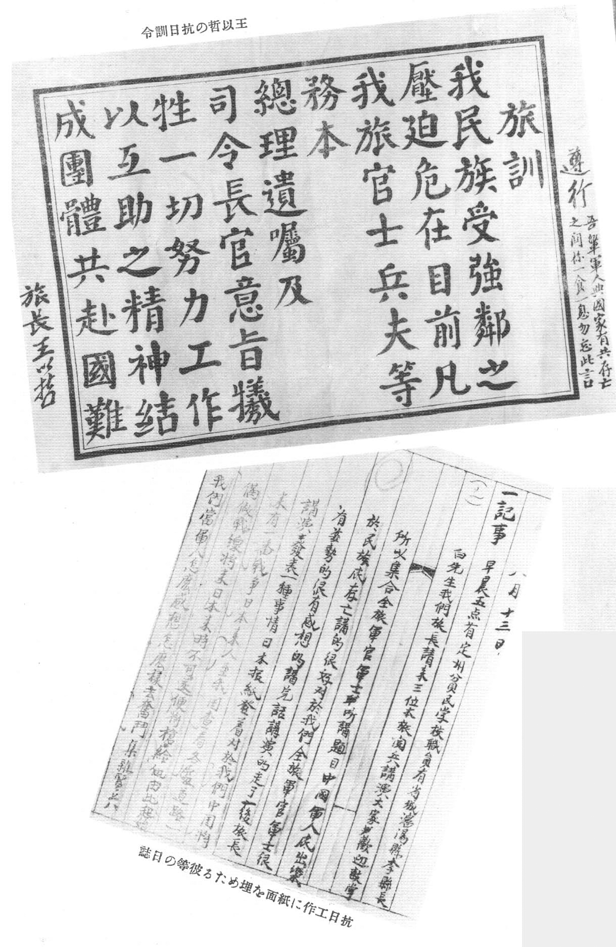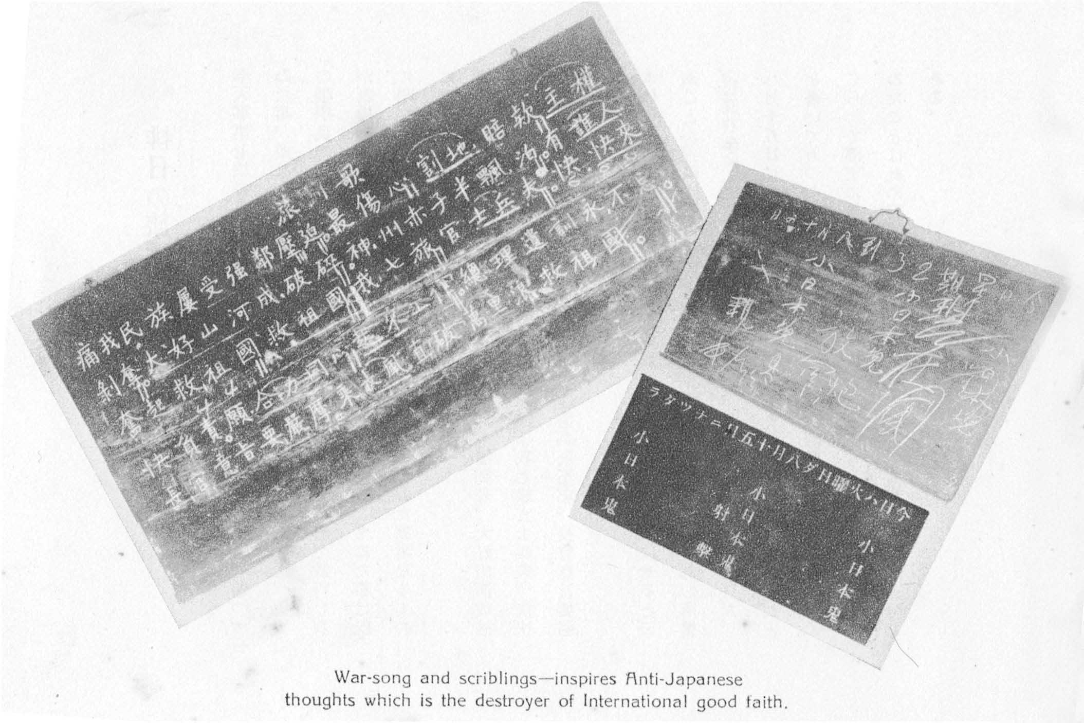 “九一八”事变前一个月,第七旅黑板上王以哲将军亲自填词的旅歌和下级官兵所书“打小日本”字样。(《满洲日支冲突事件·新闻写真集(二)》)
