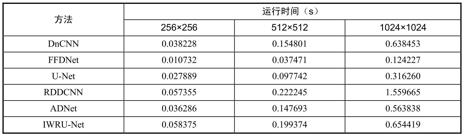 最后,在LVW数据集中尺寸为512×512的图像上测试不同图像去水印方法的复杂度,如表2-9所示。这些方法包括DnCNN、FFDNet、U-Net、RDDCNN、ADNet和IWRU-Net。复杂度评价指标包括参数量和浮点运算次数(Floating Point Operations, FLOPs)。此外,使用LVW数据集中尺寸为256×256、512×512和1024×1024的图像测试不同方法的运行时间,如表2-10所示,针对图像去水印的复杂度和运行时间,IWRU-Net也在可接受范围内。因此,IWRU-Net在图像去水印方面极具竞争力。