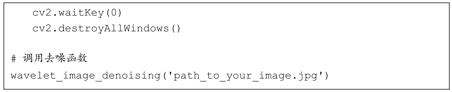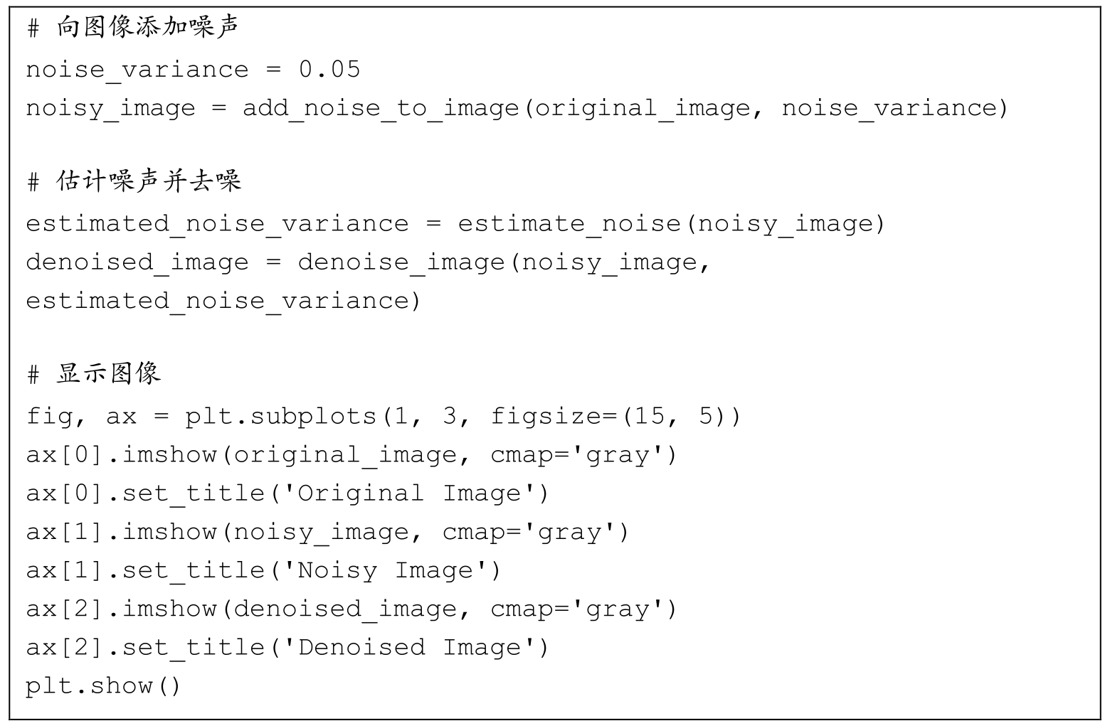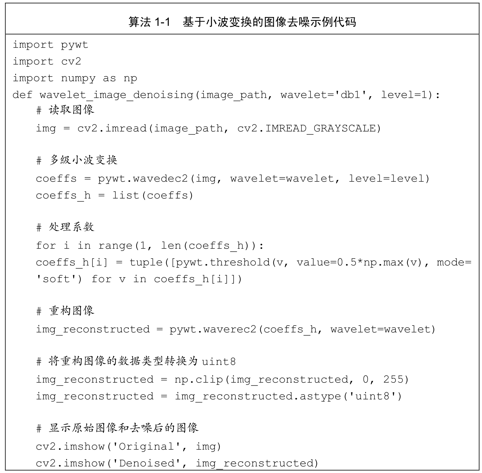 基于变换的图像去噪方法通常能够更好地保留图像的细节特征,且计算效率高。例如,小波变换能够进行多尺度分析并在不同尺度下实现图像去噪。同时,选用合适的阈值对小波系数进行处理,可以较好地保留图像的细节特征。然而,这类方法依赖的函数较多,计算复杂度较高。小波变换去噪的基本思想如下:首先,利用小波变换的多尺度分析能力分离图像中的信号和噪声;其次,通过阈值处理减弱噪声;最后,利用逆小波变换重建去噪后的图像。基于小波变换的图像去噪示例代码如算法1-1所示,该算法使用Python的PyWavelets库实现。注意:实际的图像去噪任务更复杂,需要使用更高级的模型和算法。此代码的目的是帮助读者理解图像去噪算法的基本概念。