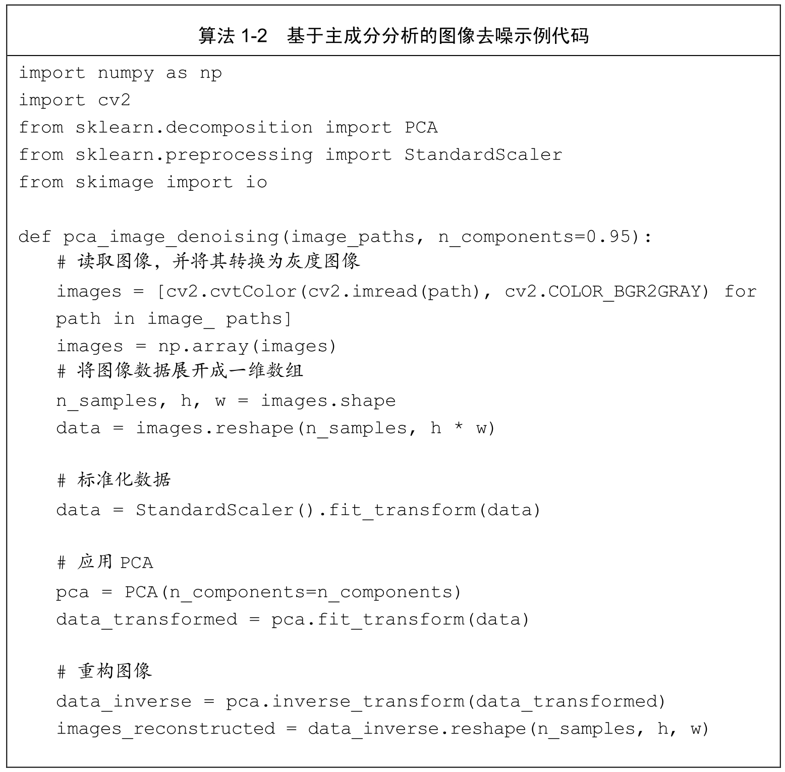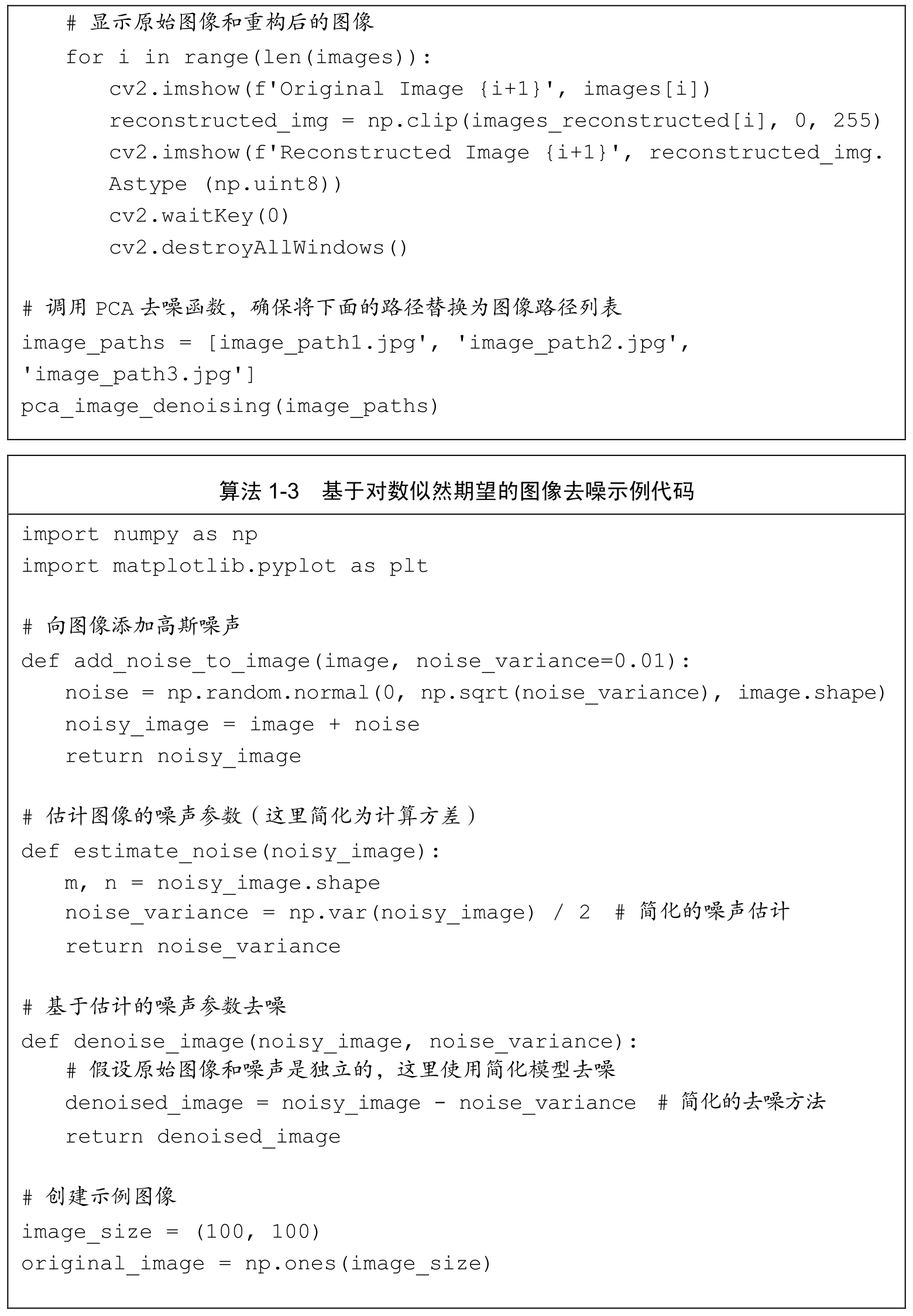 基于统计模型的图像去噪方法(如主成分分析、对数似然期望等)通过引入先验知识指导去噪过程,对图像进行建模。这类方法能更好地还原图像的真实细节信息,从而改善去噪效果。但相对于其他方法,其复杂度相对较高。当噪声与模型不相符时,采用这类方法可能无法完成图像去噪任务。基于主成分分析和对数似然期望的图像去噪示例代码分别如算法1-2和算法1-3所示。