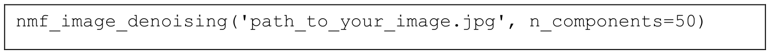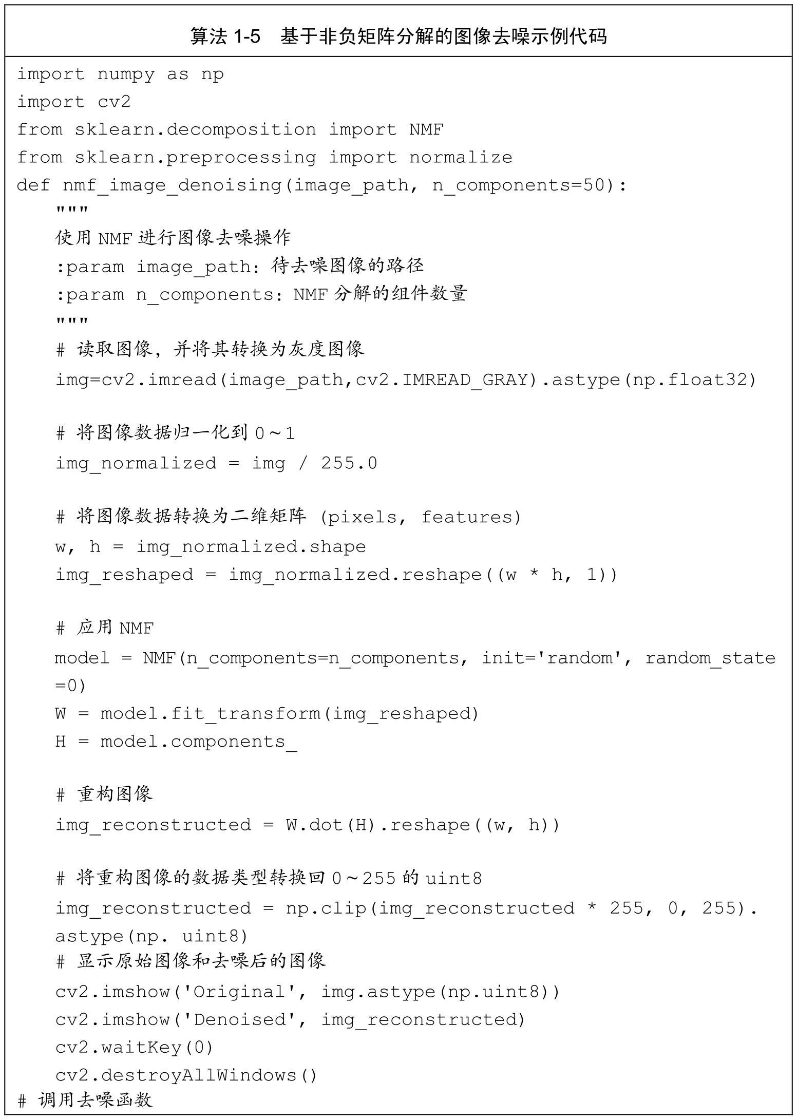 基于非负矩阵分解的图像去噪方法虽然能够提供对图像的直观解释,适用于非负图像的去噪,但是对训练数据的依赖性较强,以及在计算复杂度和参数选择等方面存在困难。基于非负矩阵分解的图像去噪示例代码如算法1-5所示。