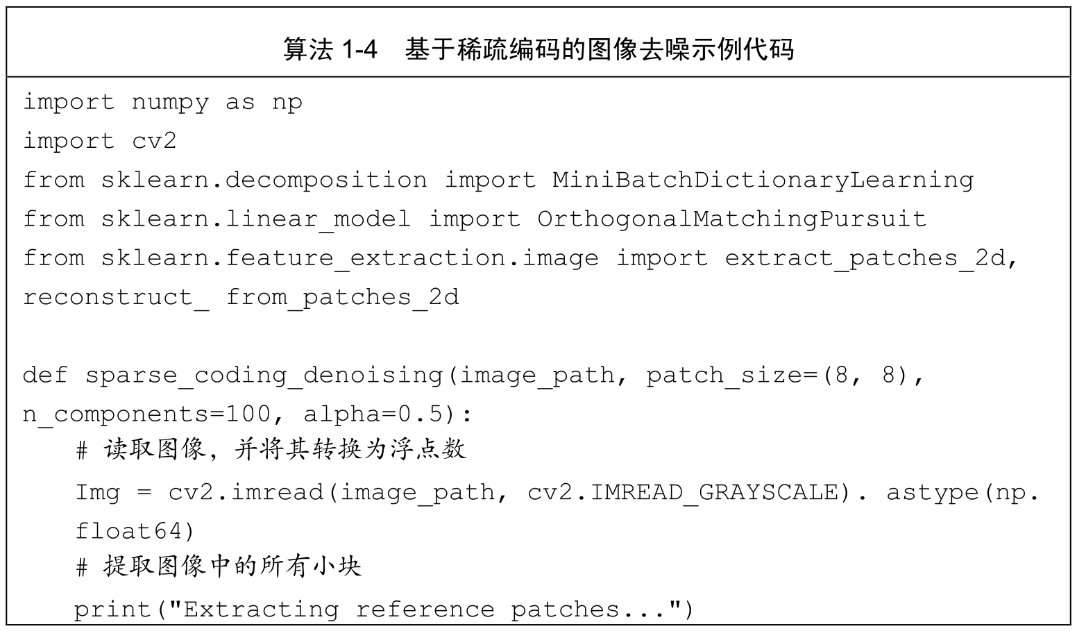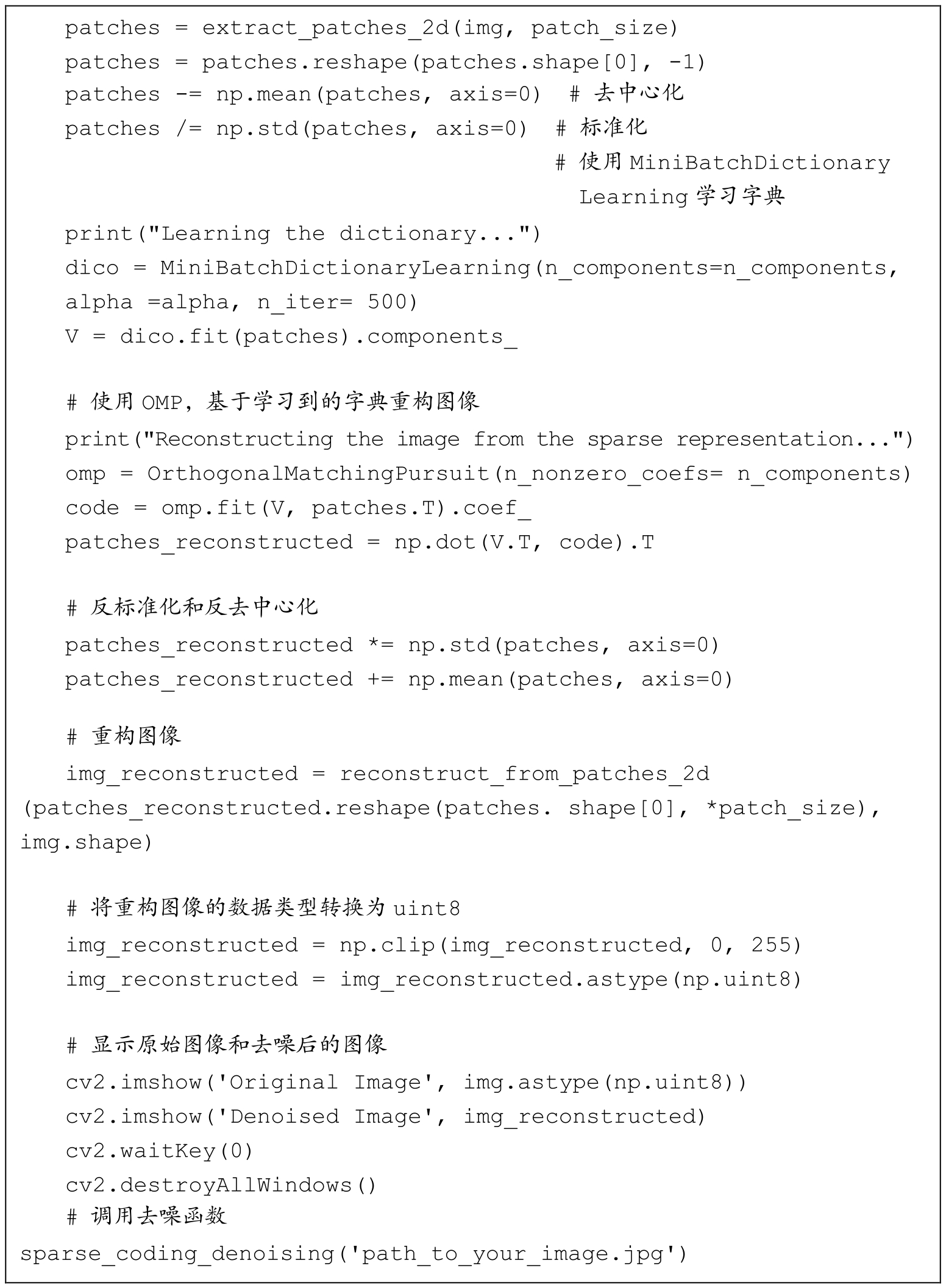 基于稀疏表示的图像去噪方法(如稀疏编码等)能够提取图像的稀疏结构和解决优化问题约束,从而有效抑制噪声成分。这类方法适用于不同类型的噪声,具有较好的泛化能力;但计算复杂度较高,需要大量的计算资源。基于稀疏编码的图像去噪示例代码如算法1-4所示。
