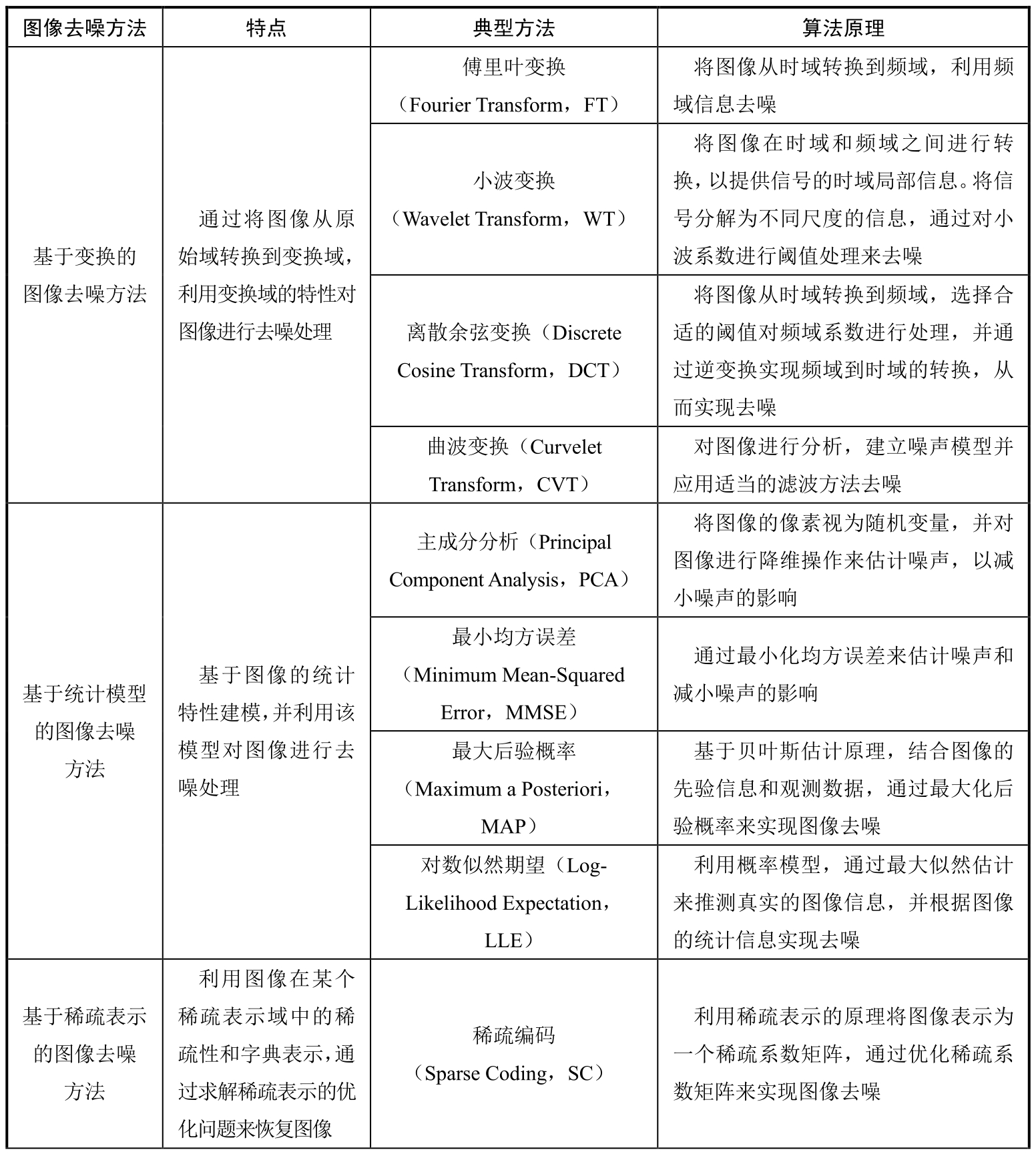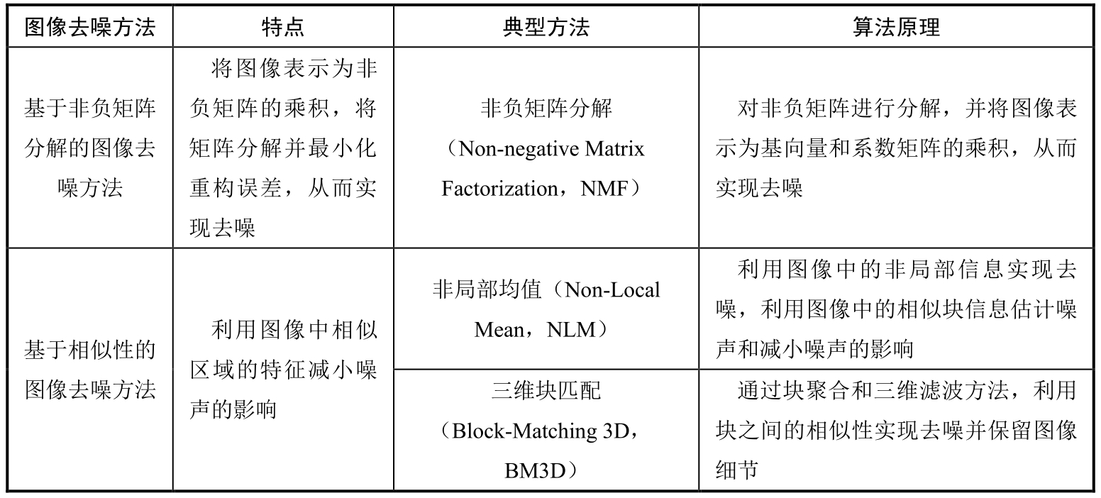 除了上述方法,还有基于相似性的图像去噪方法。总之,不同的图像去噪方法各有其优/缺点,在实际应用中,需要根据图像的特点和应用场景选择合适的方法对图像进行处理。基于传统机器学习的图像去噪方法总结如表1-1所示。