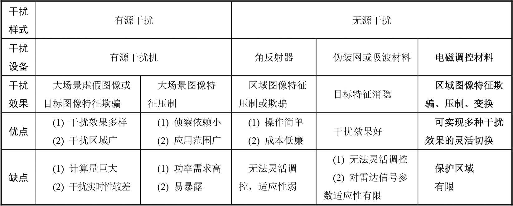人工电磁材料因具有超出自然材料限制的奇特电磁特性而备受关注,成为21世纪材料和物理领域的研究热点。其中电磁调控材料可以通过外加激励获得对电磁波特征量的灵活快速调控,受到了研究者广泛的关注 [9] 。在目标防护领域,传统研究从材料学科的角度分析其电磁特性,实现了目标雷达散射截面(Radar Cross Section,RCS)的缩减。 通过材料调控技术,可以使目标的电磁散射特性发生改变,这样本身不主动向外界辐射电磁能量,却可以实现对于被保护目标回波信号的调控功能。 从信号调制角度来看,相当于以无源的方式实现了有源调制的效果。从干扰效果来看,既可以实现多假目标特征欺骗,又可以改变或遮蔽真实目标雷达特征,还可以消隐目标的雷达特征,这对于弥补传统无源干扰技术的缺陷,具有重要的理论研究价值与军事应用意义。表1.1所示为针对SAR典型干扰样式的对比分析。