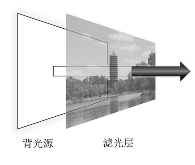 液晶显示(Liquid Crystal Display,LCD)是通过电场改变液晶材料的排布,调控光的偏振态,来呈现显示内容的显示技术。LCD是一种受光型的显示,需要有额外的光源才能发光。如图2-1所示,背光型LCD需要一个背光源来实现显示。