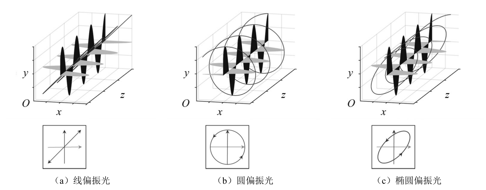 偏振光是指电场矢量的振动方向不变或有规则地变化的光,可分为平面偏振光(线偏振光)、圆偏振光和椭圆偏振光:线偏振光的电场矢量的振动方向在传播过程中只有一个方向;圆偏振光和椭圆偏振光的电场矢量随时间有规则地改变,即电场矢量末端轨迹在垂直于传播方向的平面上呈圆形或椭圆形。图2-3展示了线偏振光、圆偏振光和椭圆偏振光。如果电场矢量的振动在传播过程中只是在某一确定的方向上占有相对优势,则这种偏振光被称为部分偏振光。