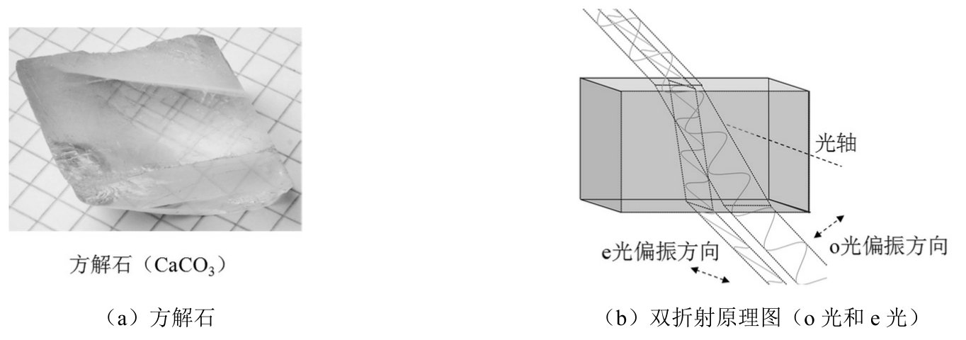 双折射效应是指当同一束入射光照射到各向异性晶体时,发生两个不同方向的折射的现象,如图2-8(a)所示,透过方解石能看到两条实线,双折射效应的实质是晶体各方向上的介电常数及折射率不同。