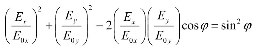 式中, E 0 x 和 E 0 y 分别为 x 、 y 方向正交电场分量的振幅; ω 为光的角频率; φ x 和 φ y 分别为 x 、 y 方向正交电场分量的初相位。偏振椭圆的方程为