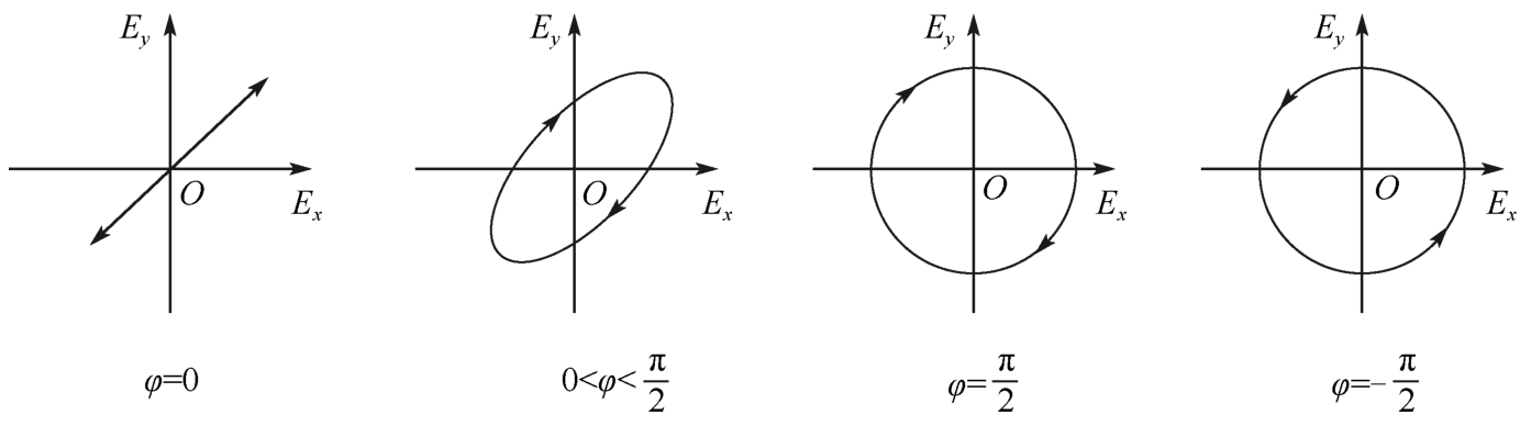 如图2-5所示,当正交电场分量初相位的相位差 φ 为0时,偏振光为线偏振光;当相位差 φ 为 ± π/2时,偏振光为圆偏振光;当相位差 φ 为正时, E y 领先于 E x ,此时偏振光为右旋偏振光;当相位差 φ 为负时, E y 落后于 E x ,此时偏振光为左旋偏振光。