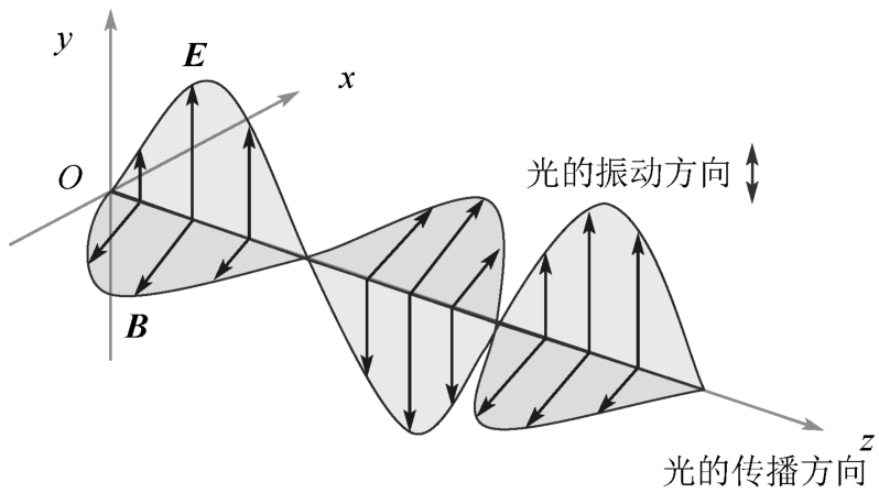 光是电磁波,也称为光波。电磁波是横波,即振动方向与传播方向垂直的波。作为对比,声波是纵波,振动方向与传播方向平行。光的电场、磁场方向相互垂直。平面光的电场矢量 E 和磁场矢量 B 均垂直于波矢方向(波阵面法线方向)。平面光是横波。光的横波特性如图2-2所示。