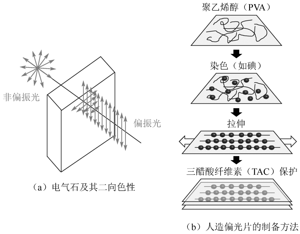 人造偏光片有多种。其中的一种制备方法是先用具有网状结构的高分子化合物聚乙烯醇(PVA)薄膜作为基片,再浸染具有强烈二向色性的碘,经硼酸水溶液还原稳定后,将其单向拉伸4~5倍,如图2-6(b)所示。拉伸后,碘分子整齐地排列在薄膜上,具有起偏或检偏性能。三醋酸纤维素(TAC)是保护PVA层的常见材料,其最重要的性能是光学性能,如高透过率、低散射率、各向同性的折射率等,同时还具有较高的强度、抗热敏感性。