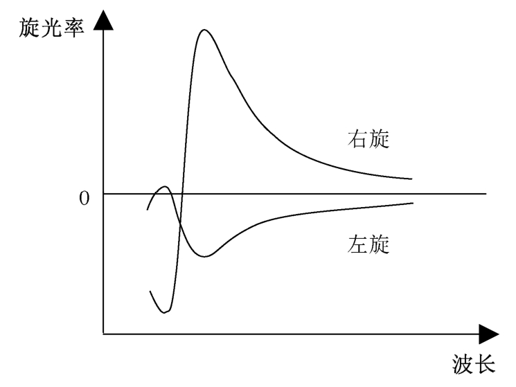 式中, α ( λ )为旋光率,与入射波长有关。若白光入射,则不同颜色(波长)偏振方向的旋转角度不同,该现象被称为旋光色散。如图2-11所示,利用这个特性可以确定分子的构型,如左旋、右旋。