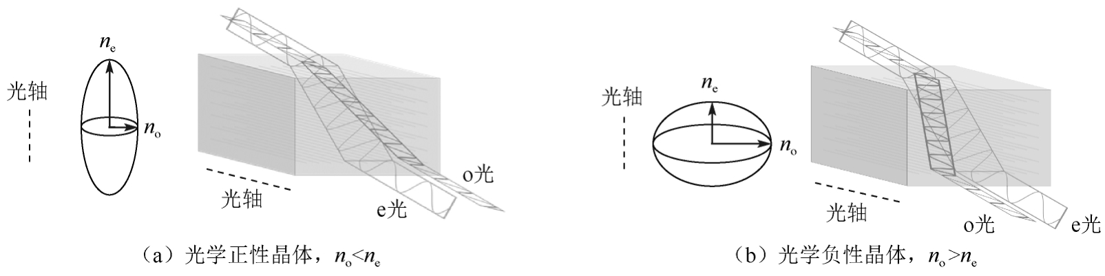 图2-9 光学正性晶体与光学负性晶体的双折射效应